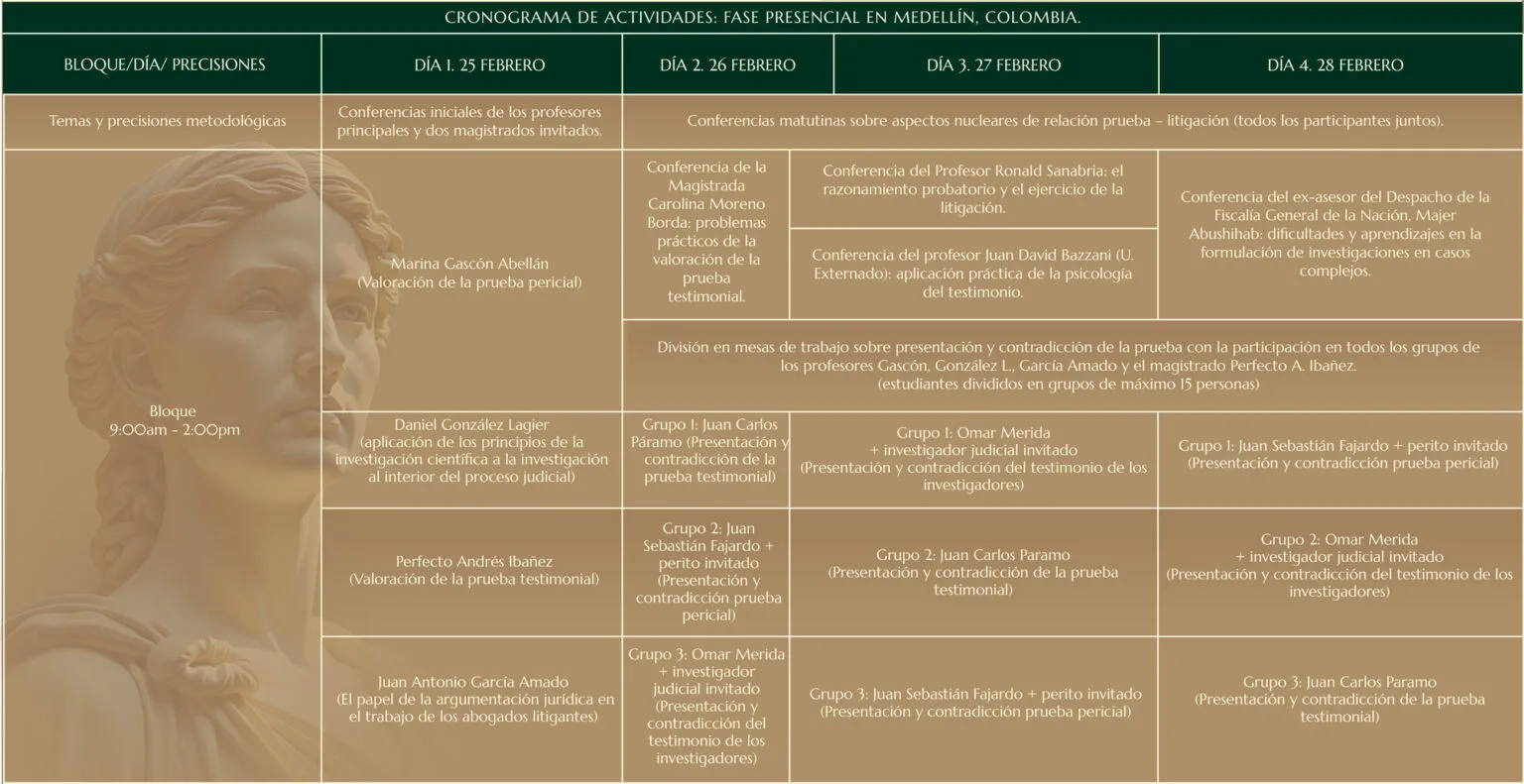 La segunda es la joya de la corona. Durante 4 días, en la hermosa ciudad de Medellín, Marina Gascón, Daniel González Lagier, Juan Antonio García Amado y nada menos que el magistrado del Tribunal Supremo Español, Perfecto Andrés Ibañez, liderarán las conferencias y mesas de trabajo –junto a los profesores expertos en litigación– enfocadas en aterrizar los principales postulados de la teoría de la prueba y la argumentación a la sala de audiencias, a partir del análisis práctico de casos reales.